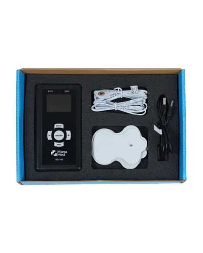 - جعبه دستگاه تسکین درد مدل TENS BD – ۱۰۰ (1 عدد دستگاه، 4 عدد پد سیم شارژر، کابل دستگاه، دفترچه راهنما کارت گارانتی)